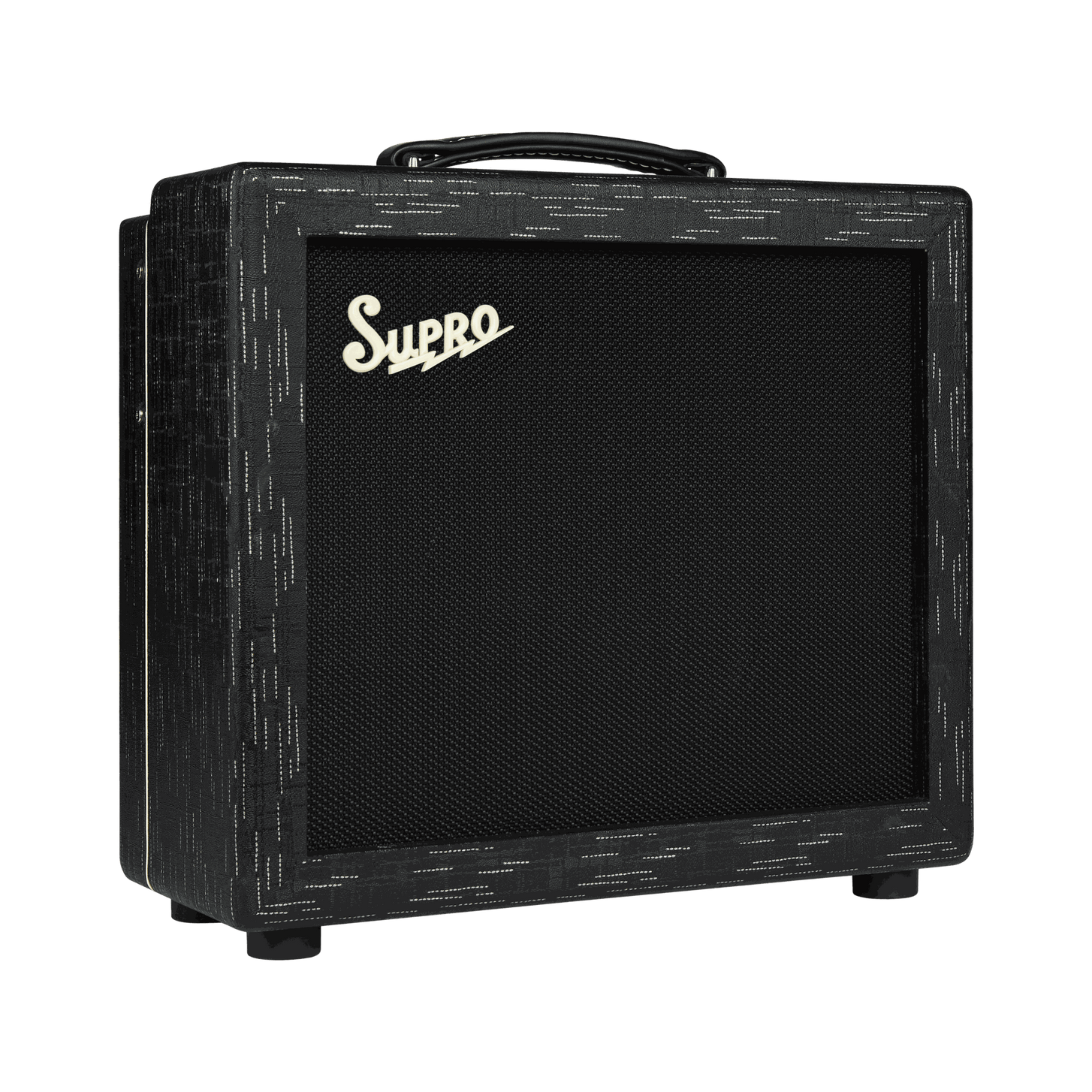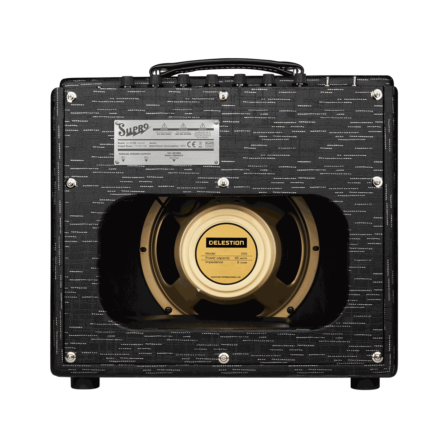 The Supro Amulet is a vintage-voiced 1x10 combo loaded with all-tube reverb and tremolo along with a new, 3-way switchable power attenuator. Designed for the gigging guitarist, this lightweight tube amp offers 15 watts, 5 watts or 1 watt of all-tube tone through a UK-made Celestion Creamback 10" speaker.