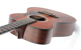 The solid mahogany top gives the guitar a dry, woody tone with clear midrange and a quick attack. Combined with the solid sapele back and sides, it creates a warm, focused sound with beautiful definition and natural compression that is especially noticeable with a light touch. The scalloped X-bracing helps the top resonate freely, giving the guitar a surprisingly full and lively sound despite its compact size.