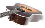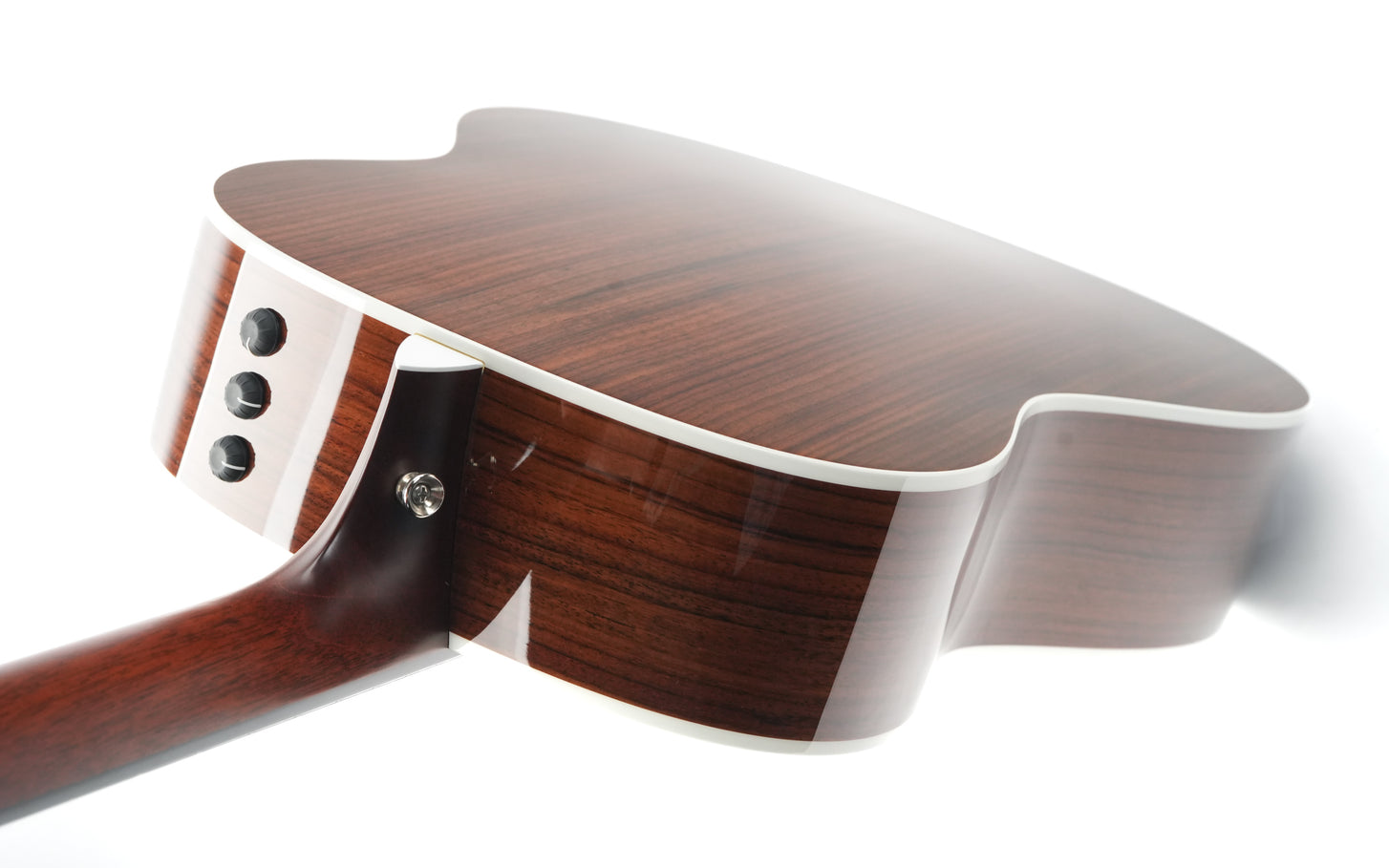 The 417e-R features a "Grand Pacific" body shape, made from flamed rosewood. The sitka spruce top is reinforced by V-Class bracing, which gives it both plenty of resonance and a high level of stability. Together with the guitar's mahogany neck, this produces a sound with a full, powerful low end and a beautiful treble response. This combi is makes this guitar very versatile.