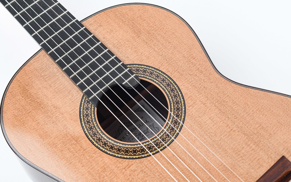 The carefully selected tonewoods have been crafted into a true masterpiece by Mengual's skilled hands. The rosewood back and sides feature a cedar top, while the cedar neck is in turn accompanied by an ebony fingerboard.