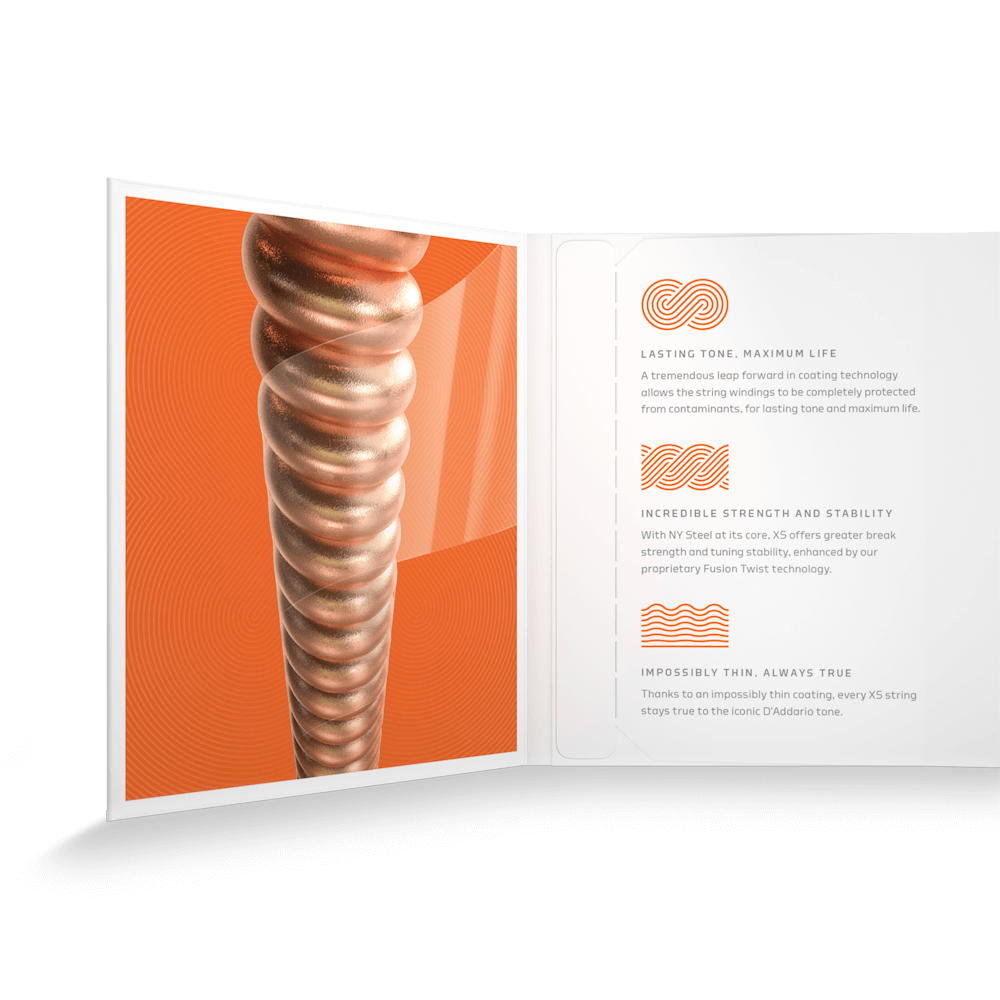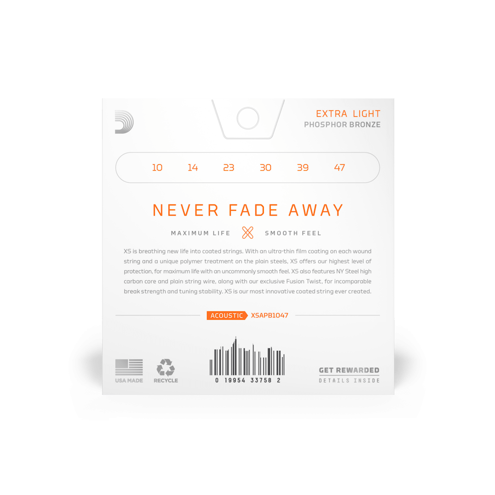 With its ultra-thin film coating on every wound string and a unique polymer treatment on the plain steels, XS offers the highest level of protection for maximum life. XS also features NY Steel high carbon core and plain string wire, and D'Addario's exclusive Fusion Twist, for incomparable break strength and tuning stability. XS is the most innovative coated string they've ever created.